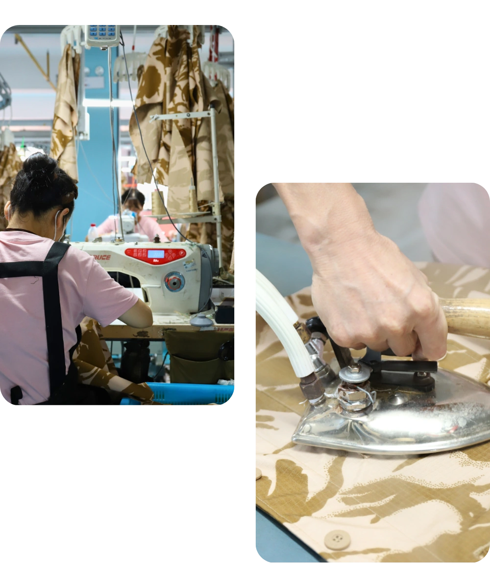 Full-range OEM production for uniforms, jackets, pants, boots, accessories, and camouflage fabrics.