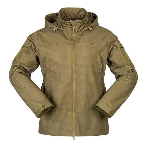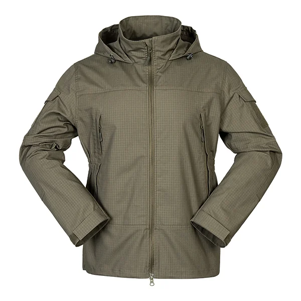 This softshell jacket is designed for spring and autumn outdoor activities, combining tactical durability with modern comfort. Made from a polyester-cotton-spandex blend, the fabric is waterproof, scratch-resistant, and breathable, making it suitable for hiking, training, and everyday wear. Featuring a hooded design, adjustable cuffs and hem, and multiple functional pockets, this jacket is perfect for outdoor retailers, tactical distributors, and OEM/ODM buyers looking for versatile wholesale apparel.